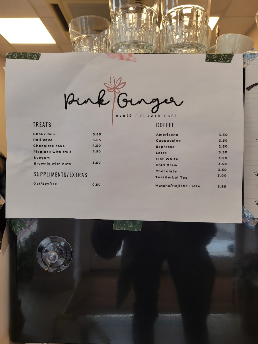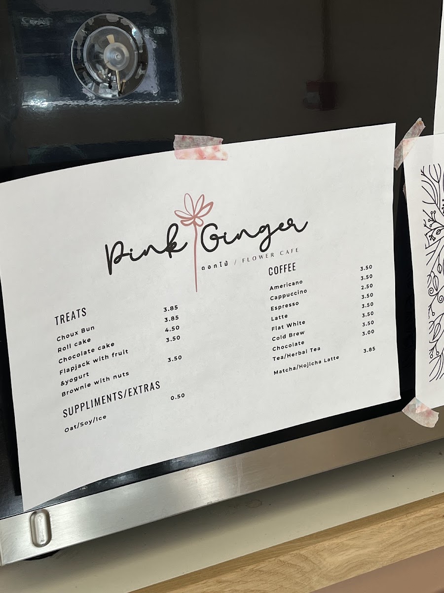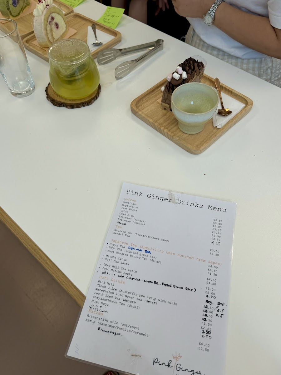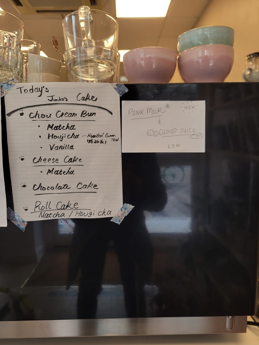 Menu highlights include juice selections, cheesecake, matcha coffee, lychee, matcha lemonade, and chocolate cake.